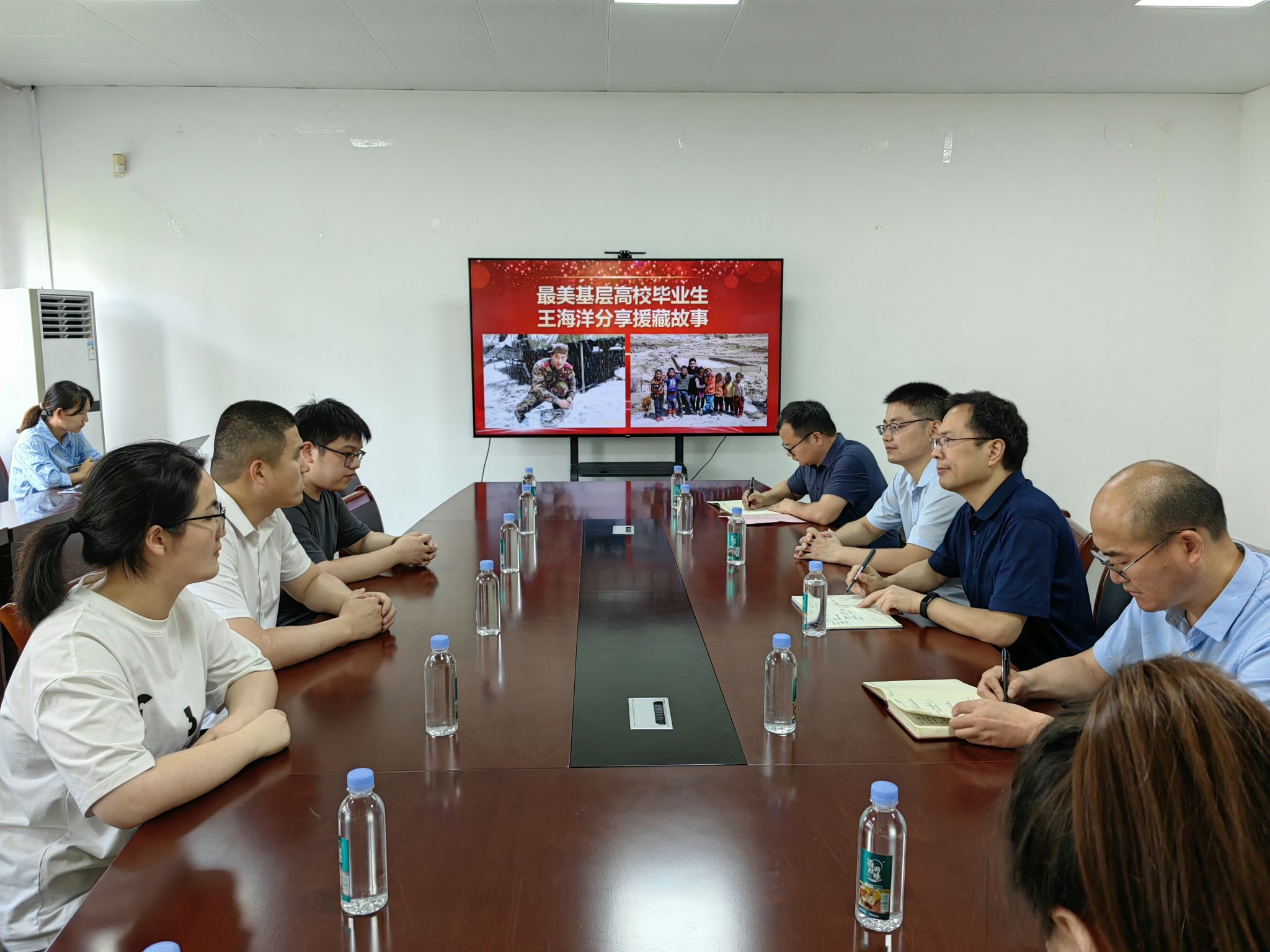 会上,全国“最美基层高校毕业生”校友王海洋分享了自己在西藏基层工作中成长的经历,表达了对母校的感激之情。王海洋希望几位即将到新疆、西藏工作的同学尽快适应从学生到基层工作者的身份转变,要有家国情怀,要脚踏实地、求真务实,尽快融入西部基层工作局面。