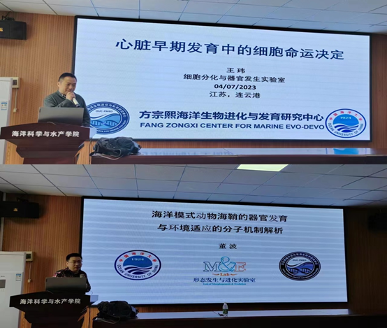 报告会上,董波教授以模式动物海鞘胚胎尾部弯曲的有趣现象为切入点,运用数学模型展示了尾部弯曲的过程,利用多种技术证实背腹不对称的脊索细胞形变和表皮分裂是海鞘胚胎尾部弯曲的主要机械力来源,同时也详细地介绍了海鞘的器官发育与环境适应的分子机制。王玮教授主要围绕海洋模式动物海鞘心脏早期发育中的细胞命运决定展开介绍,利用高通量单细胞测序、细胞谱系追踪、生物信息学分析等技术,详细解读了心脏早期发育过程中的分子调控机制。