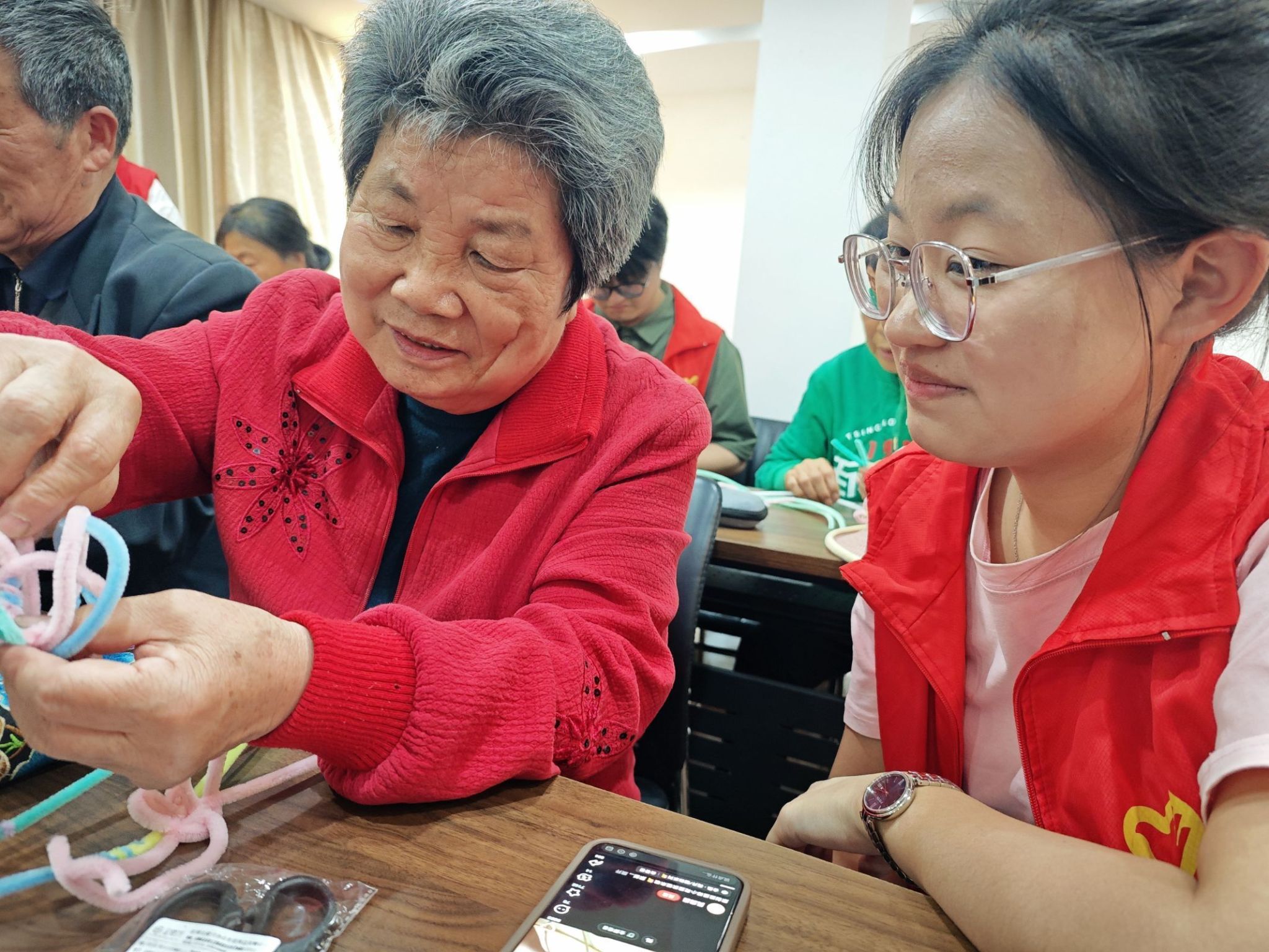 手工制作环节更是精彩纷呈。在志愿者一对一的协助下,长者们用彩色扭扭棒创作出各式各样的手工作品。有的编织出鲜艳的花朵,有的塑造出灵动的小动物,还有的制作了精美的饰品。活动现场,老人们专注的神情与志愿者们暖心的陪伴相得益彰,构成了一幅温馨的画面。